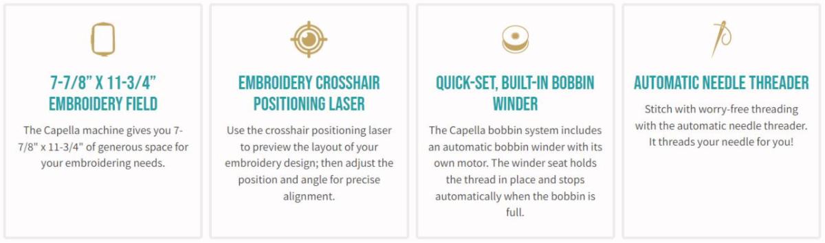 The Baby Lock Capella is the ideal single-needle, free-arm embroidery machine with the largest hoop being an 8" x 12". Its crosshair positioning laser allows for perfect design placement, and the free-arm provides the ability to embroider in tight areas such as inside pockets and sleeves. It can even embroider on stuffed animals, tote bags, and hats!