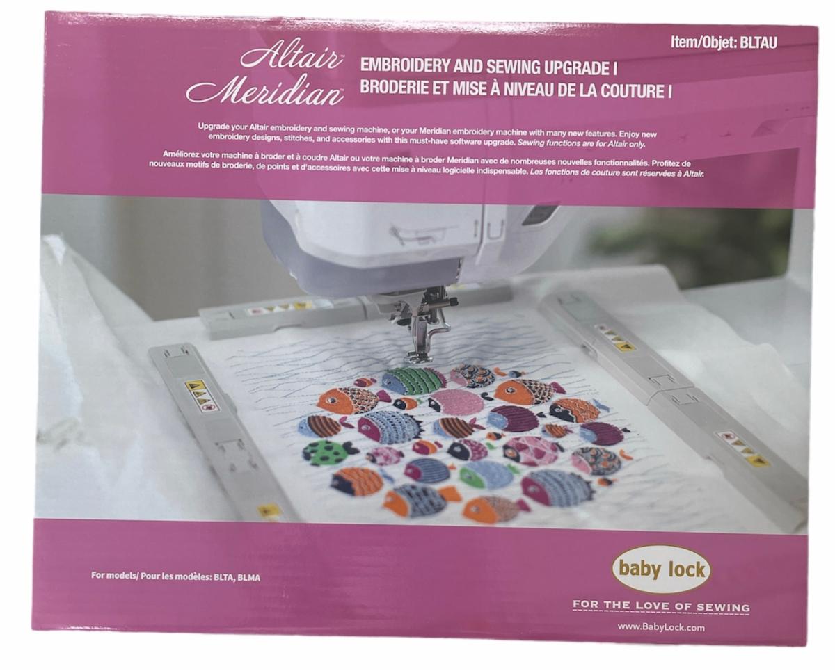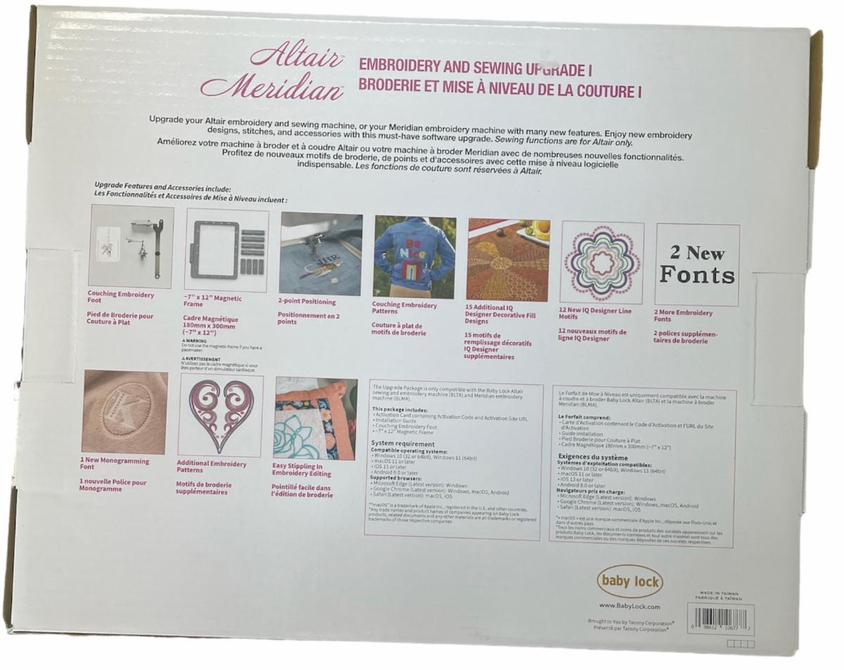 Upgrade your Altair sewing and embroidery machine or Meridian embroidery machine with many new features. The upgrade kit brings your machine to true state-of-the-art status with features such as 2-point laser positioning, matrix copy, embroidery couching and much more. It includes the new 7”x12” magnetic hoop that makes embroidery edge-to-edge quilting effortless. Plus, it adds 50 new embroidery designs, couching foot w/ guide & 40 couching designs, new fonts and much more.