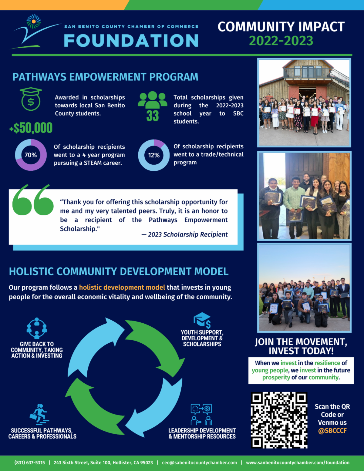 The 2024 scholarship recipients will pursue career pathways that range from engineering, healthcare, education, business, computer science, political science, and more. The SBC Chamber and Foundation firmly believes that investing in our community's youth contributes to the overall economic and social well-being of San Benito County. As such, we have a commitment to support all pathways of success including college, vocational, trade, and technical careers.