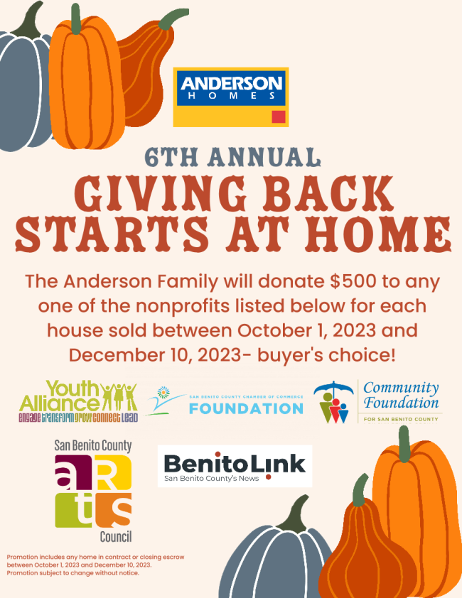 Anderson Homes’ “Giving Back Starts at Home” kicks off annual promotion, running for the SIXTH year in a row in Hollister (and fifth in Los Banos).