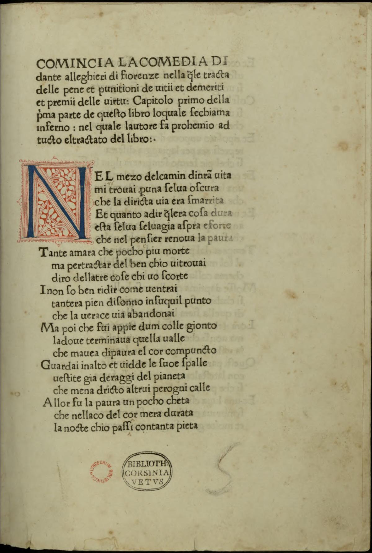 [According to ancient manuscripts, the original title of La Divina Commedia was just 'Commedia', alternating with the form 'Comedia' (containing one ‘m’). It was only in the 18th century editions of the work that the title La Divina Commedia was confirmed.]