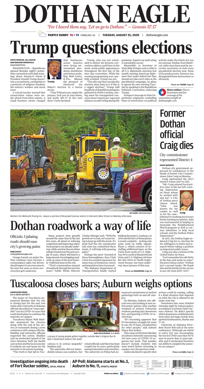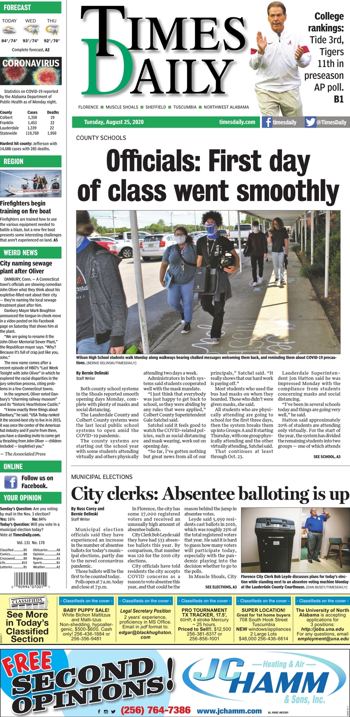 Times Daily - Average new virus cases steady statewide; Tuscaloosa moves to close bars