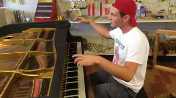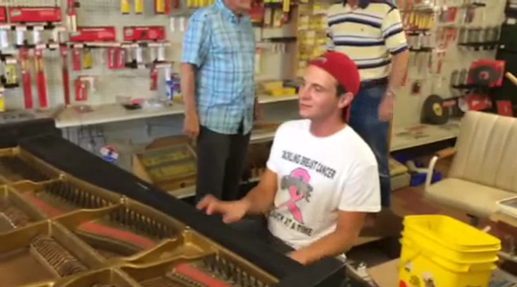 The pianist with the backwards red cap wailing on "Whole Lotta Shakin' Goin' On" is Jacob Tolliver, and the hardware store is Market Street Hardware in Portsmouth, OH.