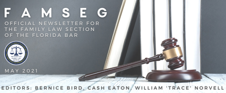 The Florida Legislature completed the legislative session on April 30, 2021. I am pleased to report there were no changes to the current alimony and timesharing statutes. The officers of Legislation, along with the committee members, put in countless hours monitoring every bill that could impact family law in Florida. I want to thank the officers and the committee members for their hard work and dedication.