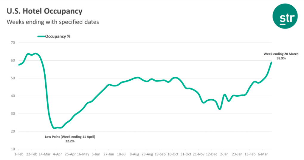 For the week of Mar 14th - 21th, occupancy was recorded at 58.9%, a 93.9% increase from the comparable, pandemic-affected week last year. And more importantly, represented almost 85% of occupancy regained from the 2019 benchmark.