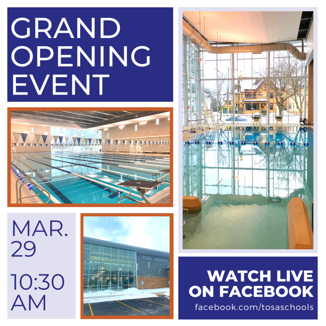 Please join us on Monday, March 29 at 10:30 am for a virtual grand opening event as we officially open the Wauwatosa Aquatic Center at Wauwatosa East High School to students, staff and the community.