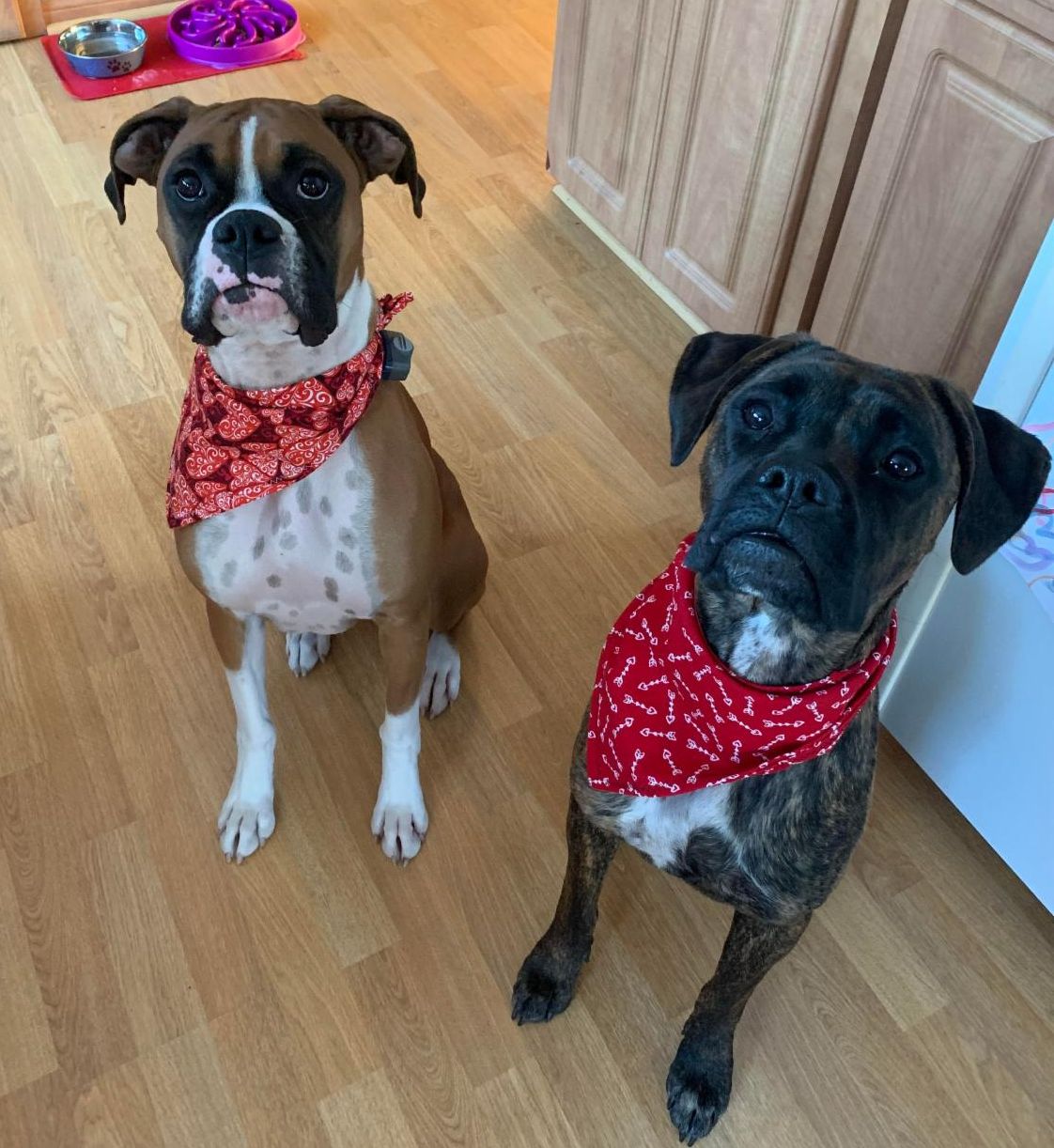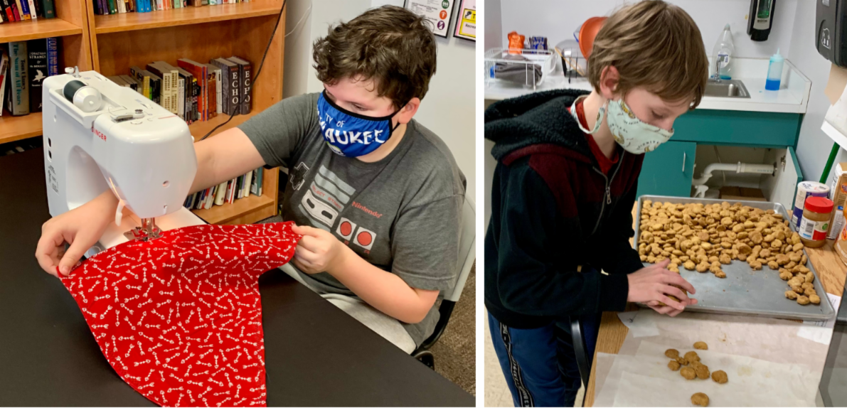 Montessori Principal Ashley Imperiale's dogs Rebel and Rose model products created by 7th and 8th grade students. See "Micro-Economy Run by Wauwatosa Montessori Students Helps Kids Learn Real-Life Skills and Lessons" below for more information.