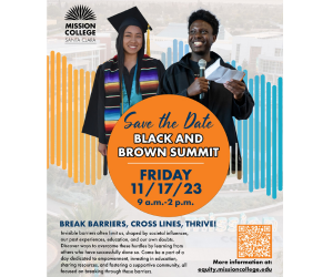 Don't miss the opportunity to participate in Mission College's 4th annual Black and Brown Summit on Friday, November 17, from 9 a.m. to 2 p.m. under the theme "Break Barriers, Cross Lines, Thrive!"