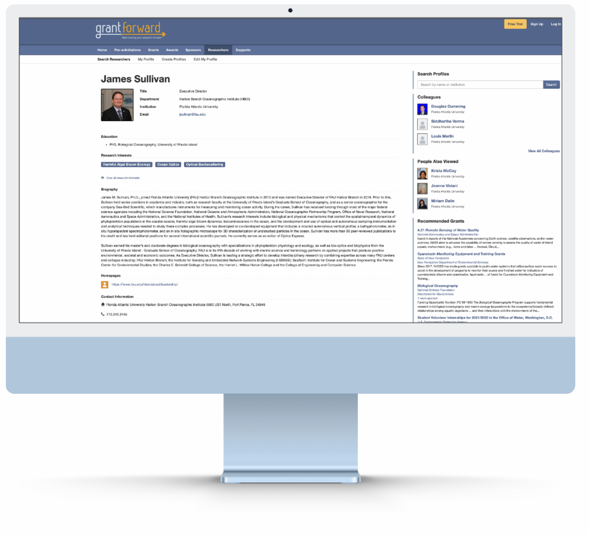 Check out this sample GrantForward profile created in less than 10 minutes: Jim Sullivan, Ph.D., executive director of FAU's Harbor Branch Oceanographic Institute.