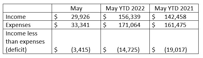 Expenses are up $9,589 (5.9%) from 2021 but are in line with the budget (expenses through May at 40.6% of budget with 41.7% of the calendar year complete). The largest variance to budget continues to be for our facility operations where our building maintenance expenses are at 69% of the annual budget. Major costs in May for the upgraded security system was $4,630. These unfavorable variances have been partially offset by lower than budget costs for staff and office administration.