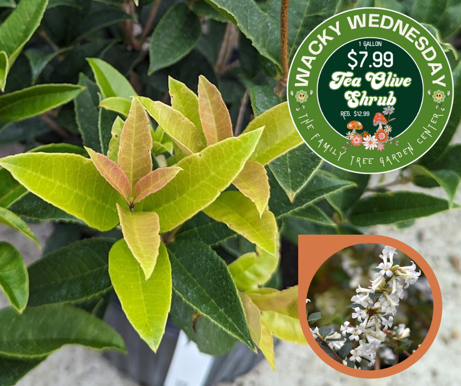 This pretty evergreen shrub looks similar to a holly, but it is actually related to the lilac. Dense multi-stemmed branches become covered with fragrant, white trumpet-shaped flowers from summer to fall. Tea olive is relatively low maintenance and considered deer-resistant. Wacky Wednesday Price: 1 Gallon $7.99 (Reg. $12.99) |