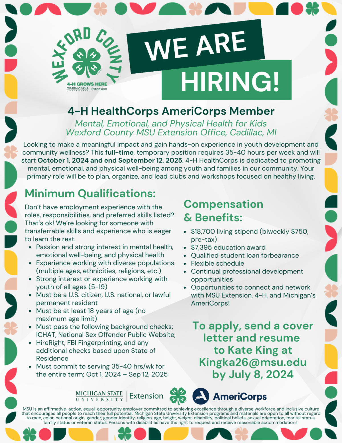 Are you passionate about empowering youth and positively impacting your community? Would you happen to know someone who fits the bill? Wexford County MSU Extension is looking for a motivated individual to join us as a 4-H HealthCorps member!