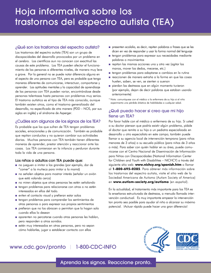 Las investigaciones muestran que niños/as que reciben un diagnóstico temprano e intervenciones para el autismo tienen más probabilidades de tener efectos positivos importantes a largo plazo sobre los síntomas y las habilidades posteriores. | |