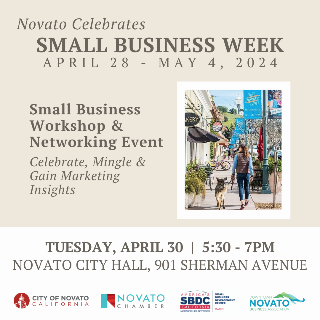 Novato Business Owners — Join us to Celebrate, Mingle & Gain Marketing Insights at our in-person event on Tuesday, April 30, 5:30pm - 7pm at Novato City Hall, 901 Sherman Avenue. The evening will include a mini workshop where you will learn tips on how to stay ahead of the curve by understanding current market trends, emerging technologies, industry changes and how to adapt your business marketing strategies accordingly.