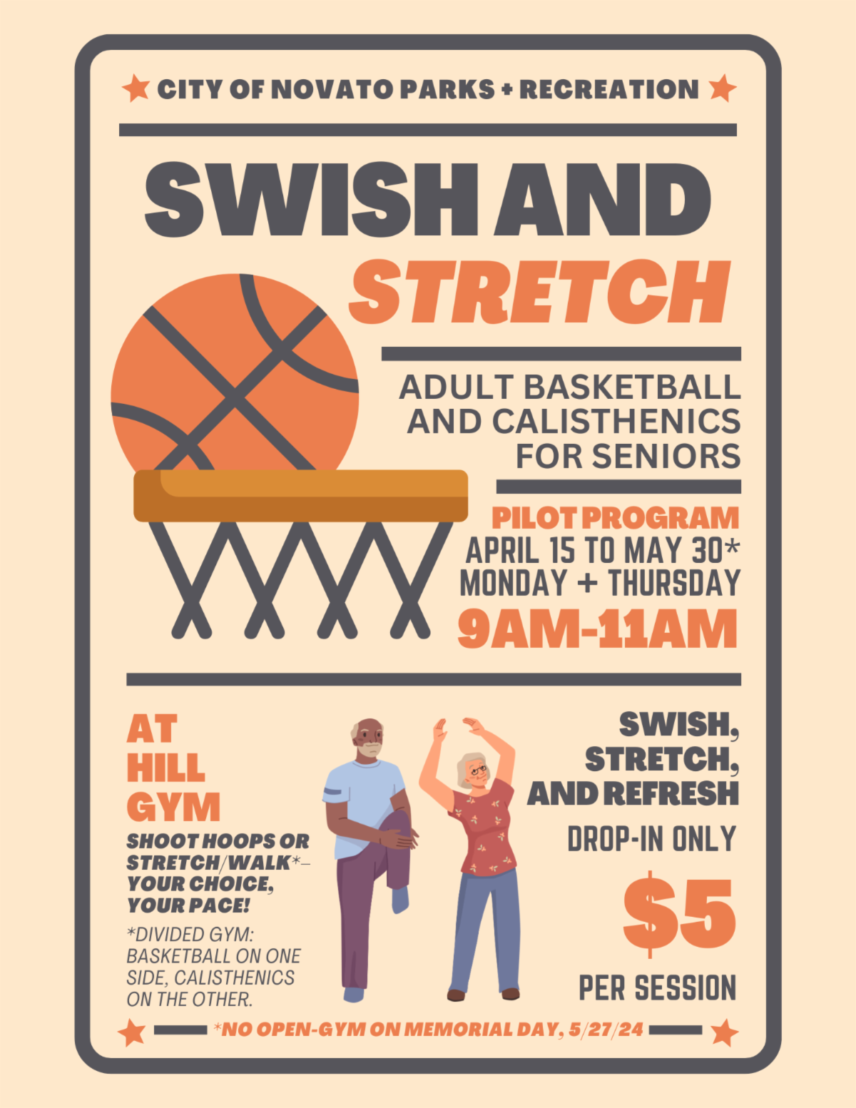 We're excited to announce a pilot drop-in program for adults and seniors looking to stay active and engaged. Starting April 15 through May 30, join us on Mondays and Thursdays from 9am to 11am at the Hill Gym for some fun and fitness!