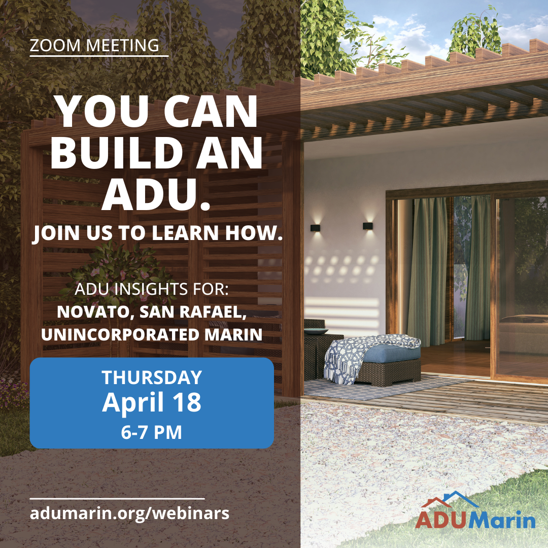 Join Novato’s Planning Division, along with staff from the City of San Rafael and County of Marin, for a webinar on April 18, 6pm-7pm, designed to explore the potential of Accessory Dwelling Units (ADUs) in enhancing local housing options.