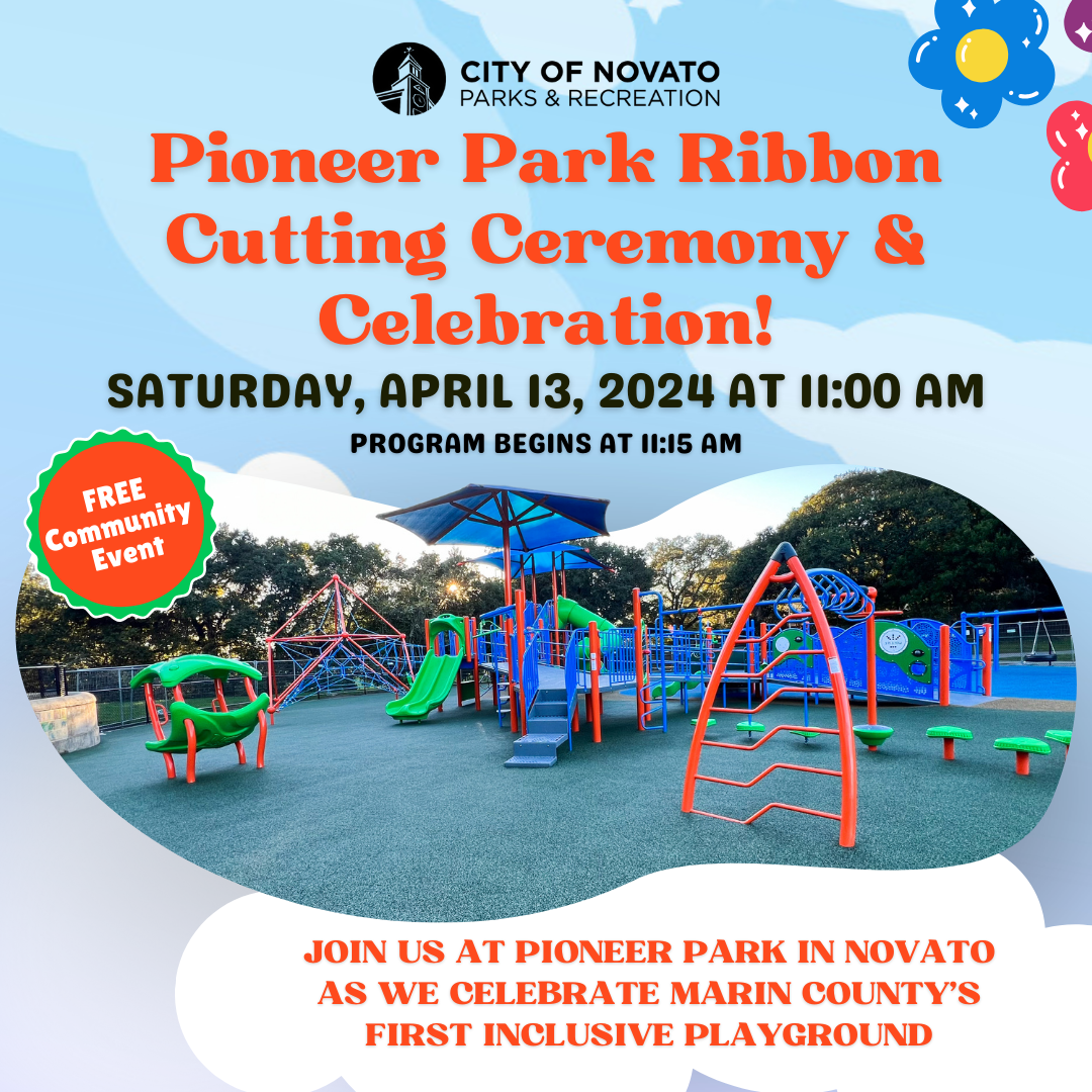The City is excited to invite you to a Ribbon Cutting Ceremony and Celebration at Pioneer Park to celebrate Novato’s first adaptive playground designed to foster inclusive play for children of all abilities. Join us on Saturday, April 13, 11am at Pioneer Park, 1007 Simmons Lane for a Novato Fun celebration with speeches, engaging activities and light snacks.