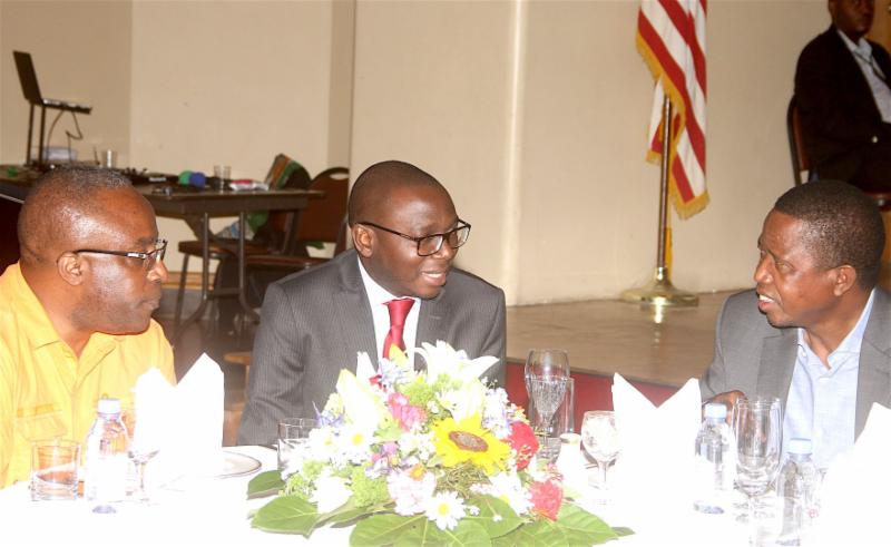 President Lungu talks to Foreign Affairs Permanent Secretary Chalwe Lombe (C) and Acting Zambia's Ambassador to the USA Joseph Chilaizya.