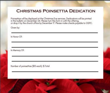 It's time to order poinsettia dedications. To order, pick up a form in the sanctuary, or call the church office. The poinsettias will be on display at the Christmas Eve services. The poinsettias are $15 each, and the deadline to order is December 17.