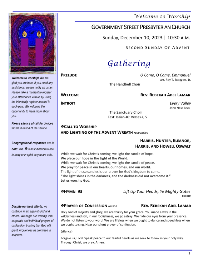 Join us on December 10 as the Rev. Rebekah Abel Lamar continues her sermon series “Songs of the Season.” The sermon is titled “Song of Mary” with scripture from Isaiah 40:1-11 and Luke 1:39-56. Music will include John Ness Beck’s setting of both “Every Valley” (Isaiah 40:4, 5) and “He Shall Feed His Flock” (Isaiah 40:11), as well as familiar hymns for Advent.