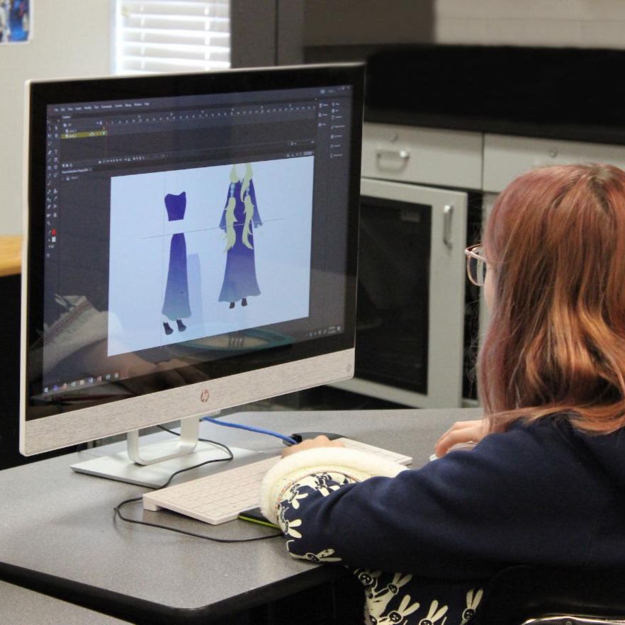 Students in this class have the opportunity to put their skills into practice and exhibit their clothing collections to a live audience during SVCTE Fashion Week.