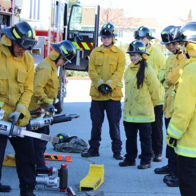 Fire Fighters from San Jose Fire Dept. Battalion 13 visited SVCTE to show students the latest tools and techniques used during fire and other emergencies. Students Misaki Koyama (from Prospect High School in Campbell Union High School District) and Refugio Infante Cortez (from Broadway High School in San Jose Unified School District) are testing hydraulic rescue tools used for prying ajar car doors open.