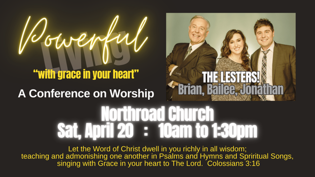 Something wonderfully powerful happens when the Word of Christ dwells richly in our lives. When "with grace in your heart" you find yourself singing and worshipping every day and in every way, a powerful life of wisdom is the result. The Lesters are a family who for generations, for 90 years, have been singing and leading others to worship Jesus. Brian, Bailee, and Jonathan will be with us! They will sing and teach in Psalms, Hymns, and Spiritual Songs! This conference will be a great day! The cost is $25, which will cover the cost of lunch. We will also be collecting a love offering for The Lesters. You are encouraged to invite a friend too.