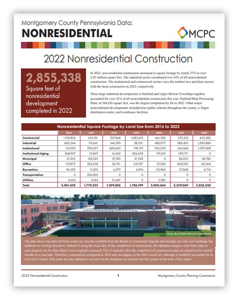 The 2022 Nonresidential Construction annual report tracks the location and type of new nonresidential (commercial, industrial, institutional, municipal, office, recreation, transportation, and utilities) construction in Montgomery County. The 2022 report shows that nonresidential construction increased in square footage by nearly 27 percent to over 2.85 million square feet in 2022. The industrial sector accounted for over 42 percent of all nonresidential construction in 2022. View the Report.