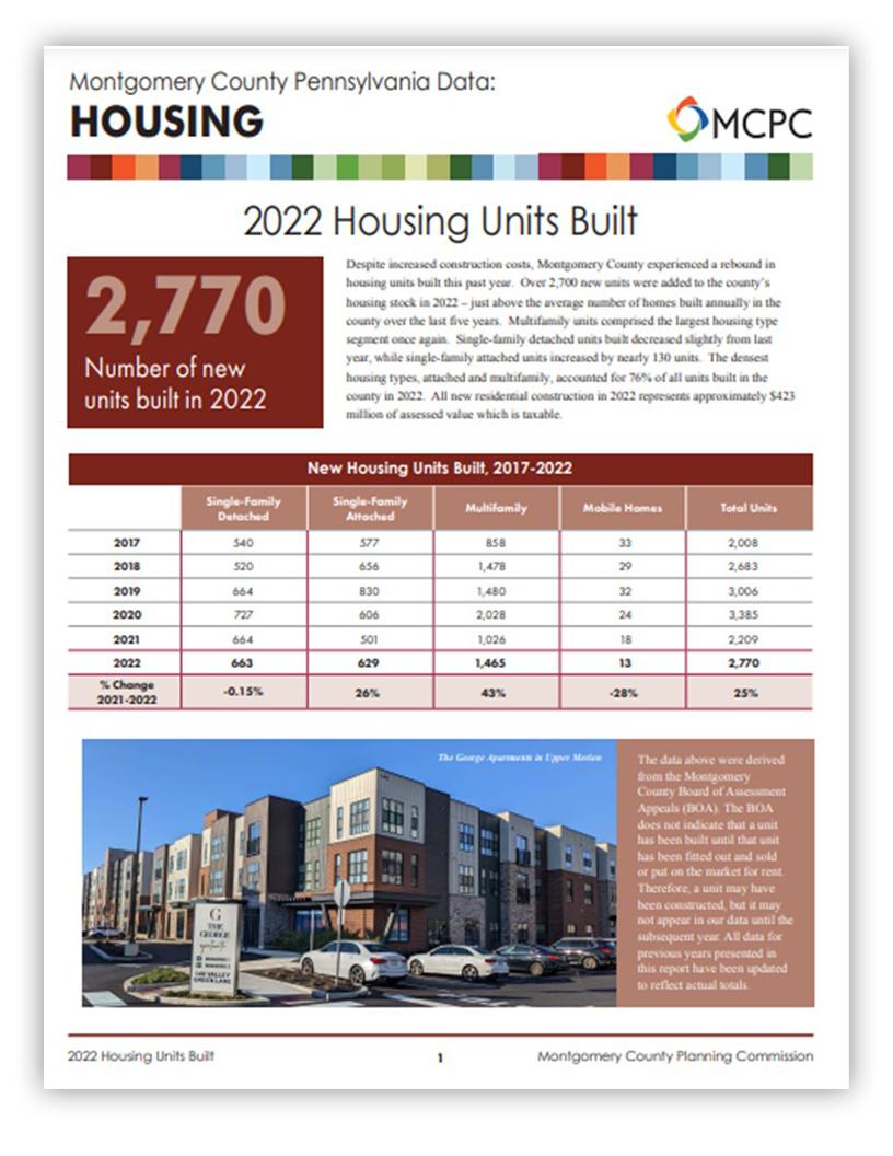 The 2022 Housing Units Built annual report tracks all housing units built (single-family detached, single-family attached, multifamily, mobile homes), their location, and characteristics (square footage and lot size). The 2022 report indicates that despite increased construction costs, Montgomery County experienced a rebound in housing units built this past year. Over 2,700 new units were added to the county’s housing stock in 2022, which was just above the average number of homes built annually in the county over the last five years. View the Report.