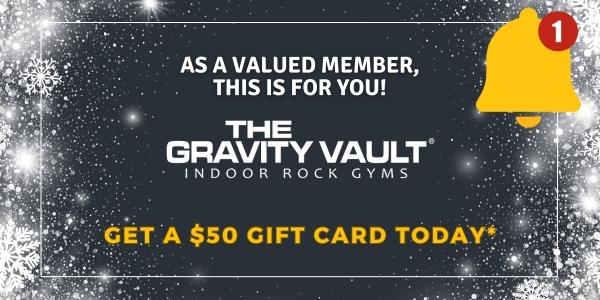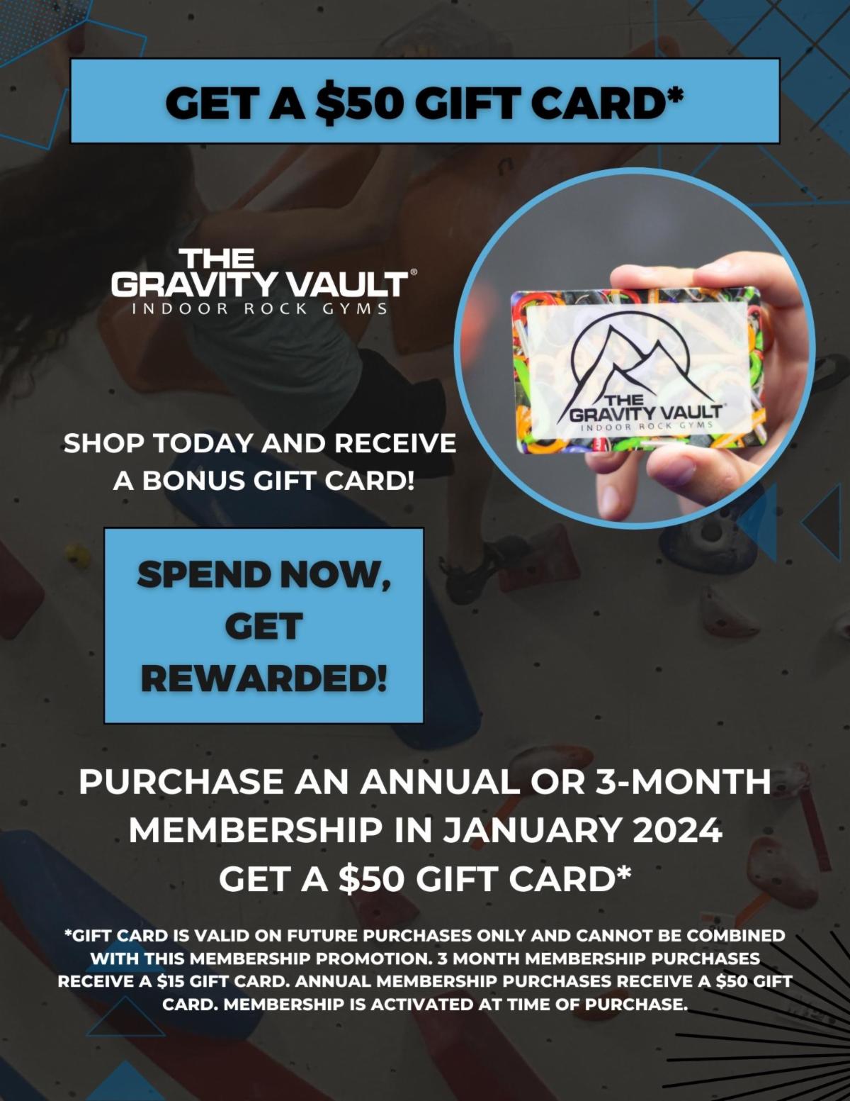 In the month of January, when you purchase an annual or 3 month membership you will receive a Gravity Vault gift card to redeem for classes, snacks, apparel, gear and more!