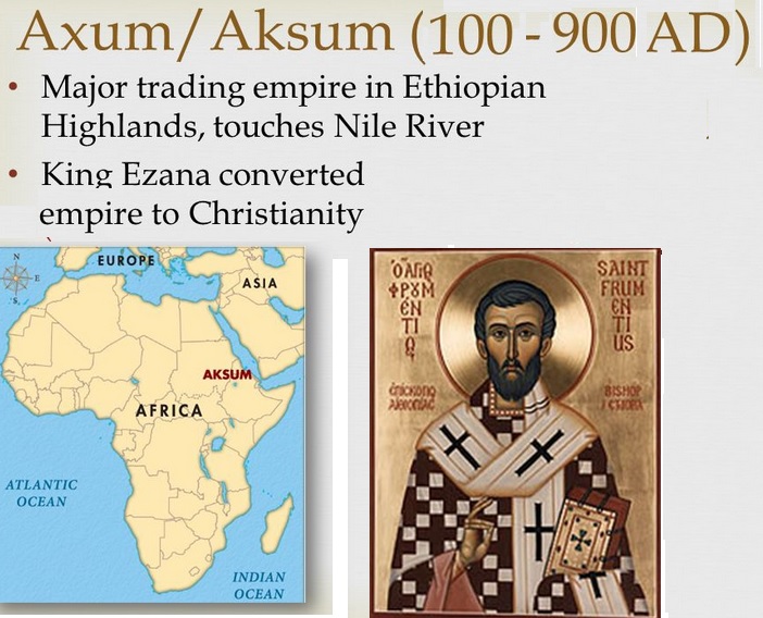 Not long after, Ethiopia, or Abyssinia, became a Christian nation when King Ezana of Aksum, who ruled from 330 to 356 A.D., converted to Christianity.