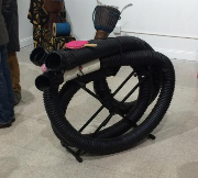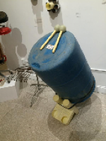 "Big Bathsheba" bass industrial drum & "Whackadoodle" mallets made from plunger handles & dog toys.
