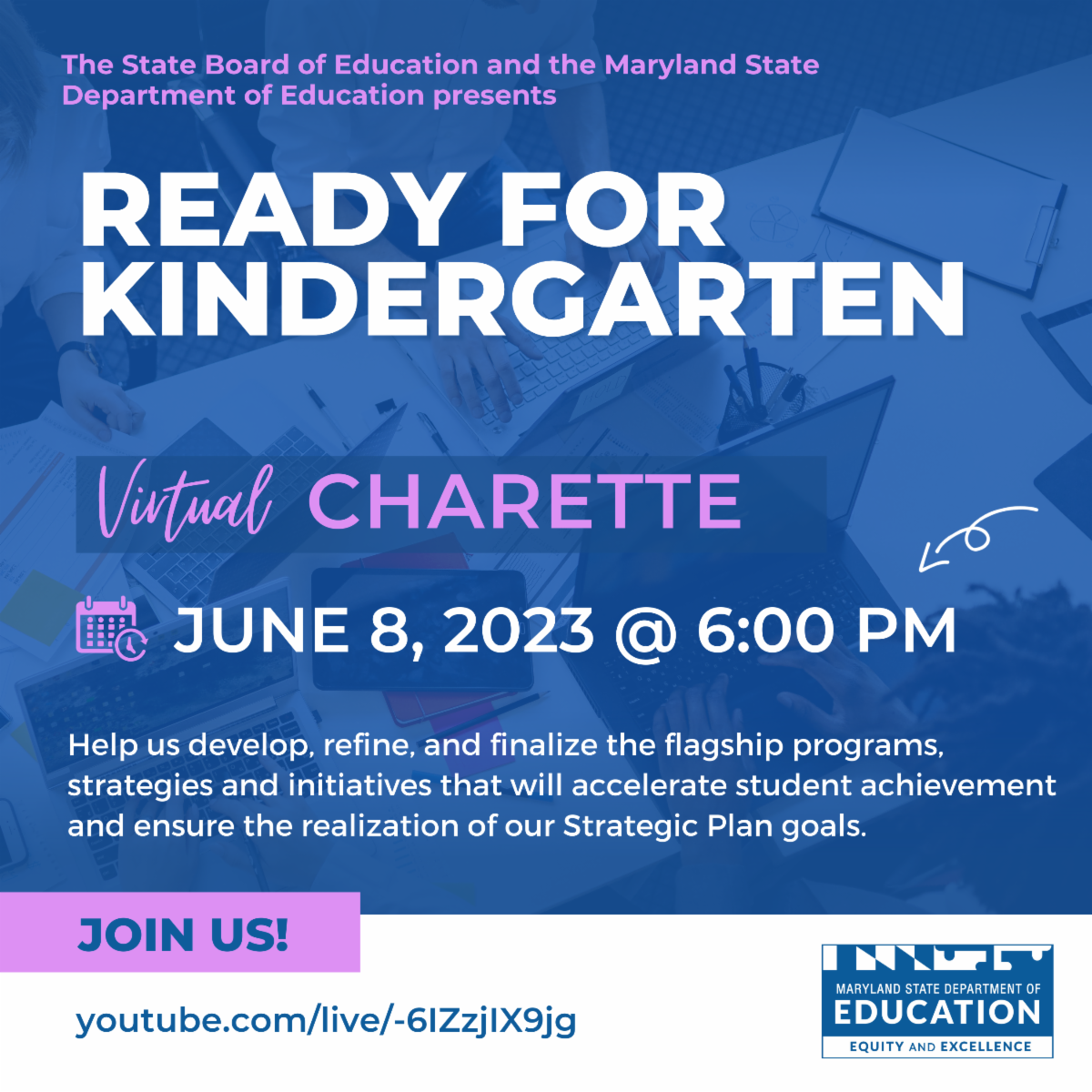 The Maryland State Board of Education and Maryland State Department of Education are hosting a virtual Ready for Kindergarten Charette on June 8, 2023, from 6 p.m. to 7:30pm.