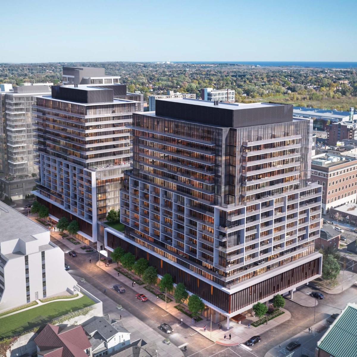 This proposal for two 18-storey residential towers will bring 630 units of living space to Downtown Oshawa. The project will also include 6,000 sq. ft. of commercial space on a two storey podium.