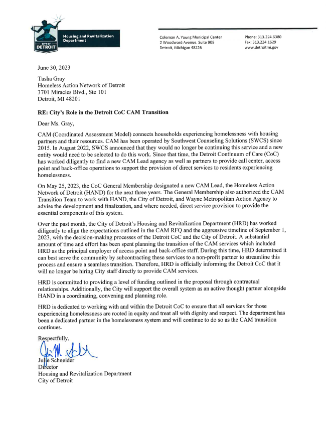 Correction: The most recent CAM transition update about the City of Detroit and CAM was incorrect. Please see the attached letter below shared by the City of Detroit (HRD) regarding CAM. | | |