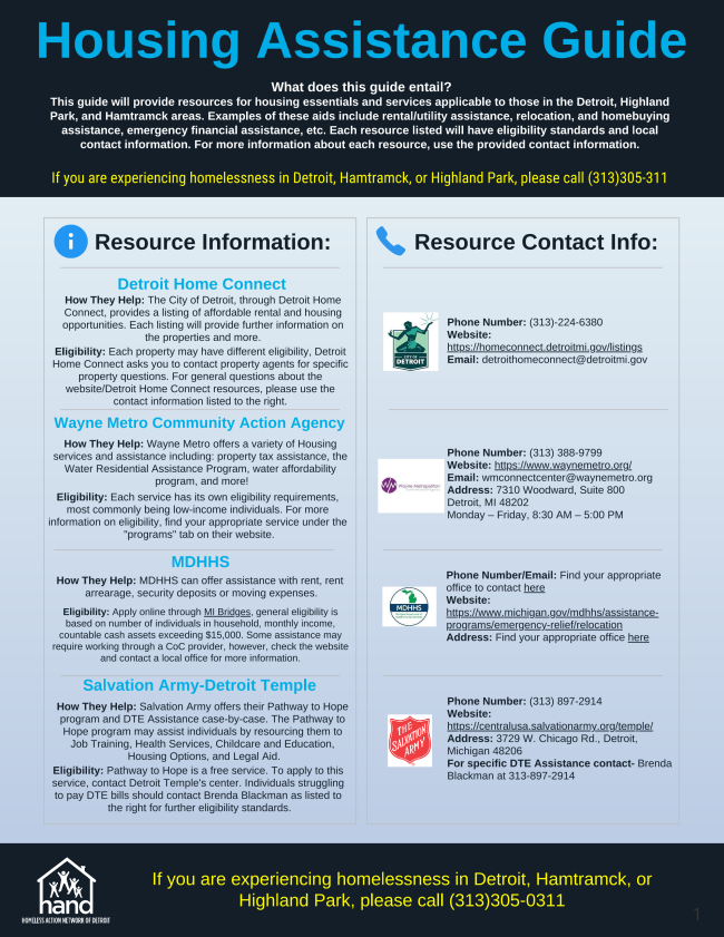If you live in Detroit, Hamtramck, or Highland Park and are experiencing homelessness, please call CAM at (313) 305-0311. Intake is call-in only.