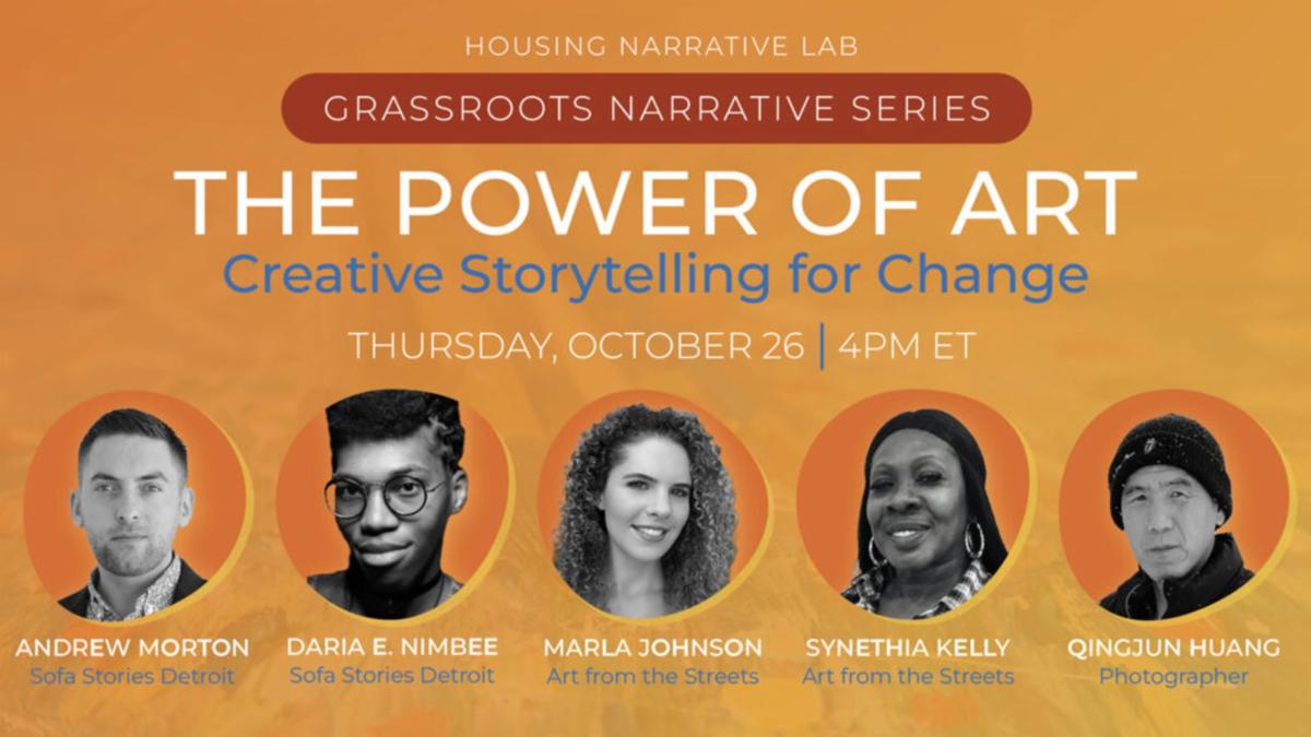 Storytelling is a key part of narrative change and stories come in many formats. Join the Housing Narrative Lab for our next webinar exploring a range of creative storytelling approaches about homelessness and housing, featuring a diverse panel of artists. We’ll discuss their goals and how they think about representing homelessness and unstable housing with care and compassion.