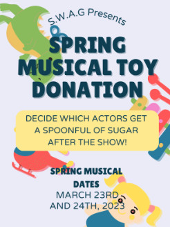 SWAG (Students Working Around Gwinnett) will be hosting a Toy Donation Drive on Thursday, March 23 and Friday, March 24 during the Spring Musical, Mary Poppins Jr., at GOC. By bringing in new/lightly used toys, you can help decide what characters will get a Spoonful of Sugar after the show!! | |