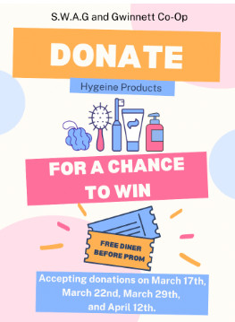SWAG (Students Working Around Gwinnett) will be offering an opportunity for students to donate items for the Gwinnett Co-Op. Our collection dates will be Friday, March 17 during Clubs & Activities Friday, before SAT testing on Wednesday, March 22, before the Wise Owl Summit on Wednesday, March 29 and during on-campus labs on Wednesday, April 12.