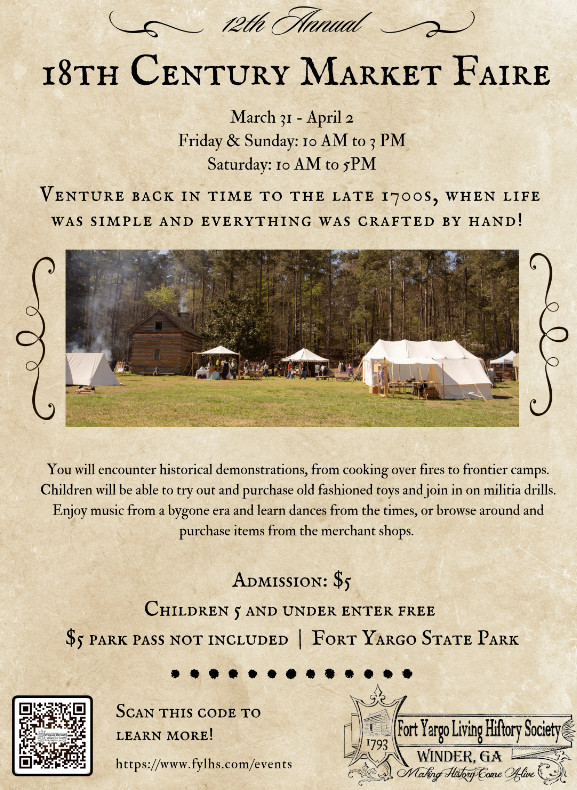 Fort Yargo will be hosting the 12th Annual 18th Century Market Faire from Friday, March 31 through Sunday, April 2. Students and families will get to venture back in time to the days of the Revolutionary War to see what life was like back before cell phones and indoor plumbing. There will be hands-on experiences and opportunities to shop in the 18th century market for toys and other items that would have been available back then.