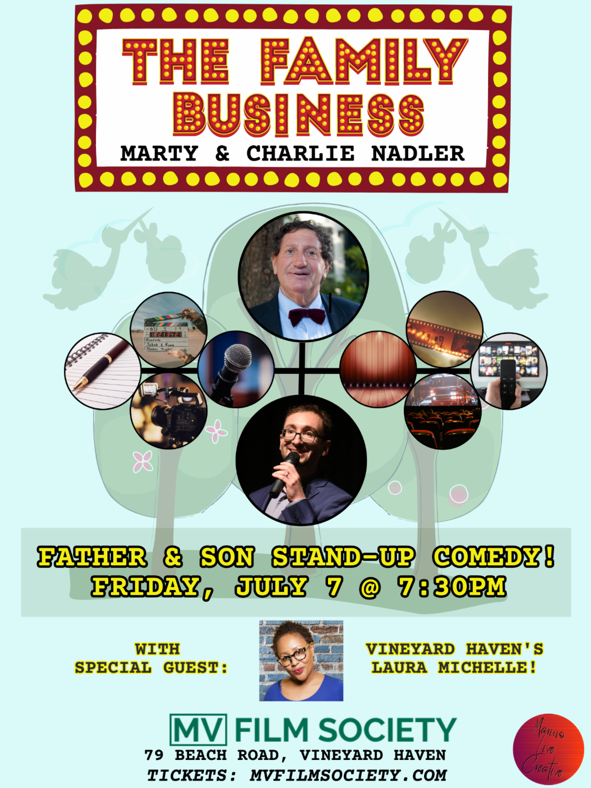 LIVE COMEDY SHOW — THE NADLERS: THE FAMILY BUSINESS With special guest Laura Michelle. The Father/Son Comedy Team of Marty & Charlie Nadler are back with an all new show! “THE FAMILY BUSINESS” delves into The Nadler’s family history in the comedy, entertainment and writing business! (Charlie’s parents met on the set of Laverne & Shirley” in the 70’s). MARTY NADLER Born and raised in the Bronx, Marty Nadler has written on many of the most classic television programs of all time. His credits include “Happy Days”, “Laverne & Shirley”, “The Odd Couple”, and “Chico and the Man”. Also an actor, he has appeared in such films as “Pretty Woman” and “Runaway Bride”.