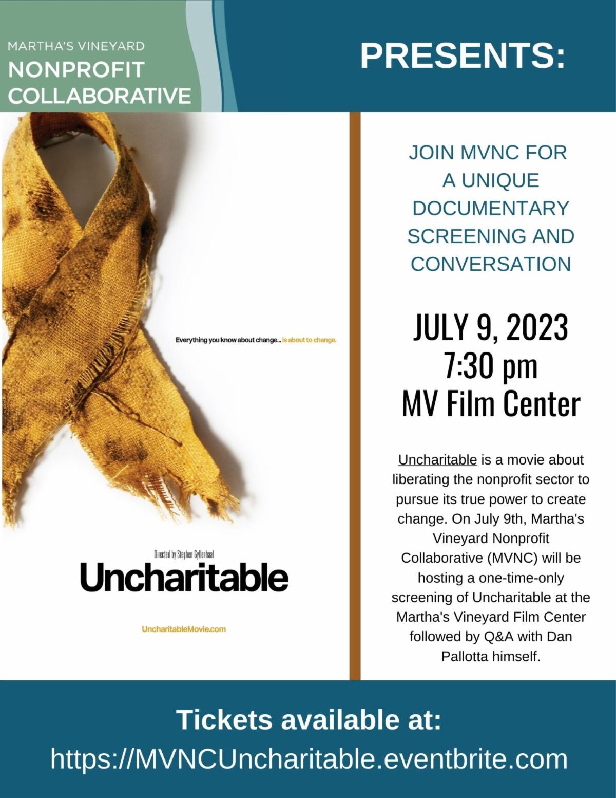 MV Nonprofit Collaborative presents UNCHARITABLE. Followed by a Q&A with Dan Pallotta. Dan invented the multi-day charitable event industry. He created the Breast Cancer 3-Day walks and the multi-day AIDS Rides, which raised in excess of half a billion dollars in nine years and were the subject of one of the first Harvard Business School case studies on social enterprise.