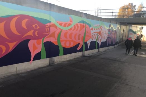The south wall (Siobhan Joseph) connects with the waters of the inlet and the artist had recently learned that the area near the Village of Esla7ah, was called Salt Water. Hence her mural design honours the sea and sea life such depicting the grey whale, orca, giant pacific octopus, six gilled shark, pacific white sided dolphin, sea lion, salmon, sea otter with the crab sea urchins, and clams. The center circle design is the salmon chief (Kwus).