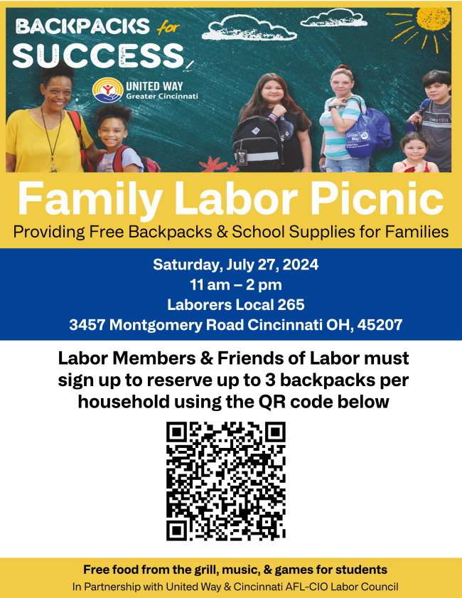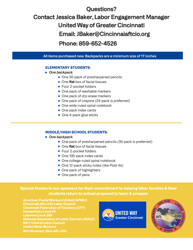 As your Labor Liaison, my role is to bring United Way programming and opportunities to union members and to continue building our valued partnership. As part of this work, I am excited to share that for the first time, United Way will include organized labor as a community partner for our 2024 Backpacks for Success program! Please see the attached flyer for more information.