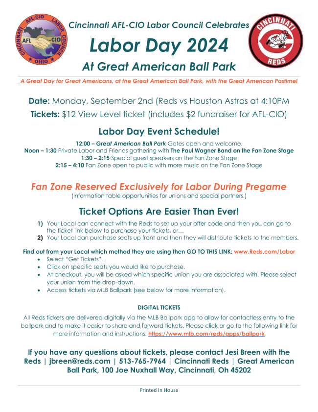 Local 392 Picnic Update – The Local 392 Annual picnic will be held on Saturday, July 27th at Stricker’s Grove from Noon until 9 P.M., the picnic invitations will be mailed out the first week of July. Please remember that the picnic is for Local 392 members, their families (children, grandchildren, etc.), and the families of our recently deceased members. Please respect that the picnic is paid for using our hard-earned dues money and is meant to be a gathering of labor families and friends of labor. Any member wishing to volunteer their time at the picnic can either show up at Strickers Grove at 9:00 A.M. for the set-up crew or contact us at the union hall and we will put you in touch with the chairperson for each area. Apprentices can serve on any of the picnic committees. A picnic committee meeting will be on Tuesday, June 25th at 5 P.M. at the Union Hall. All are welcome! Any member who works the picnic this year will receive 2 tickets to the Reds game on Labor Day at 4:10 P.M.