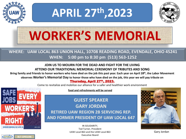 Save The Date: Worker's Memorial Day Event to Honor Those Who Have Died on the Job on Thursday, April 27th