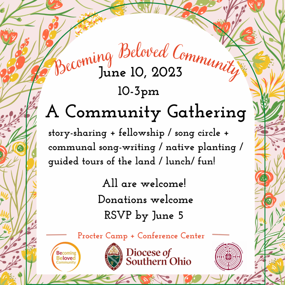 On Saturday, June 10 from 10 a.m. to 3 p.m., a team of Becoming Beloved Community leaders will host a community gathering for all ages at Procter. Activities will include fellowship and sharing stories, a song circle, communal song-writing, gardening with native plants, and guided tours of the property. Lunch will be provided.