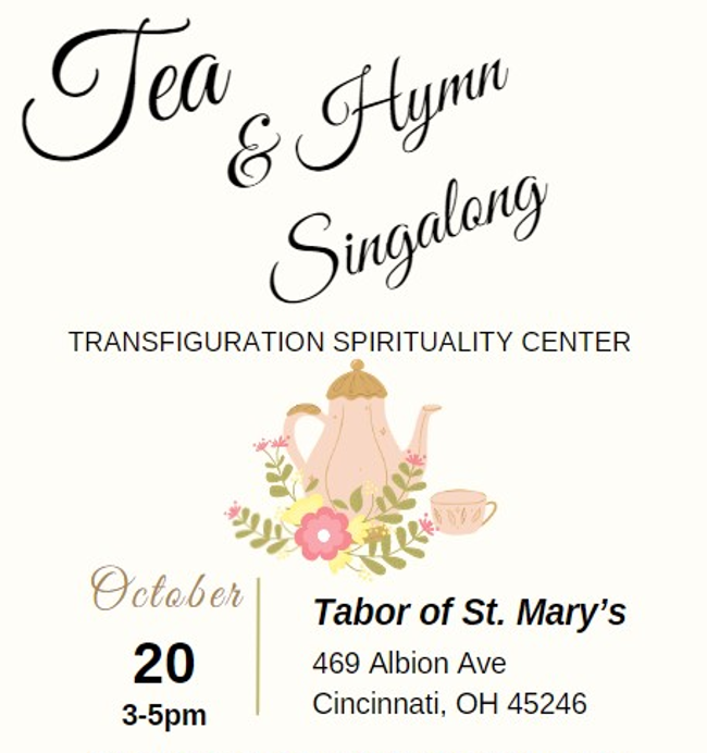 Transfiguration Spirituality Center will host a tea and hymn singalong on Friday, October 20, from 3 to 5 p.m. Light snacks will be offered with music from Anny Stevens-Gleason, minister for liturgy at Church of the Redeemer, Cincinnati, and Greear Frischmuth.
