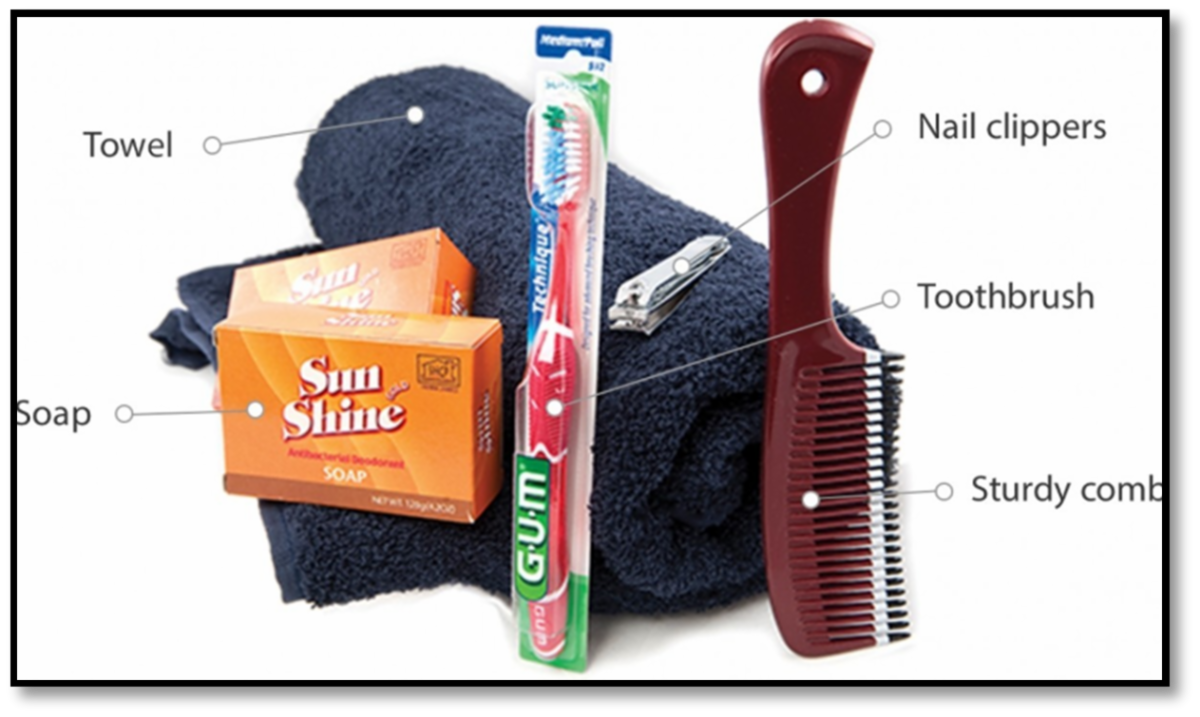 comb, 1 adult toothbrush, 2 bars of soap, & 1 lightweight, dark-colored bath towel. Thank you very much for your donations, which may be placed in the box in the Gathering Room.