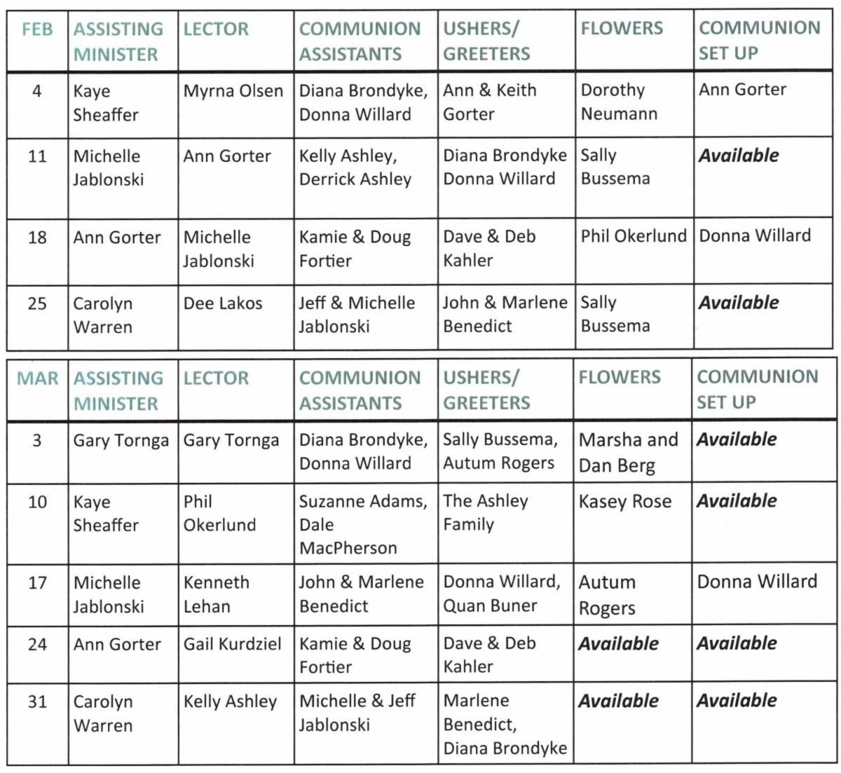 We are in need of Usher/Greeters, Communion Assistants and Lectors. Please consider participating in one or two fun ways to serve your congregation.